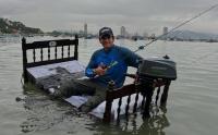 Com um motor, simulou uma pescaria entre Penha e Navegantes. Durante o trajeto, a “engenharia” desta vez não deu tão certo: a espuma molhada ficou pesada, e para não perder o equipamento, ele improvisou sentando-se no estrado com o lençol, e mantendo o equilíbrio necessário.